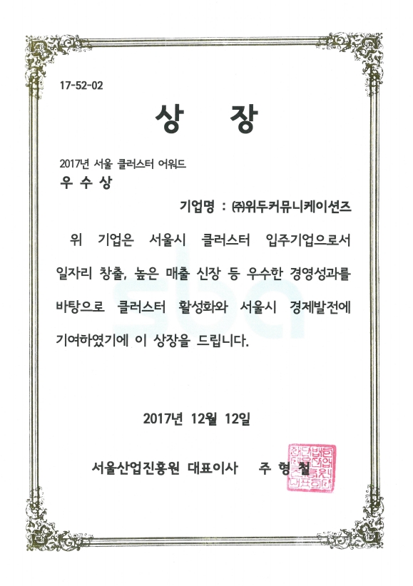 서울클러스터 어워드 우수상 페이지 정보 작성자 WeDu 댓글 0건 조회 7,004회 작성일 19-05-30 19:34 본문 2017-12-12 우수상 17-52-02 서울클러스터 어워드 서울산업진흥원 대표이사 주형철 List Previous서울특별시장 표창장 19.05.30 Next산업통상자원부 표창장 19.05.30